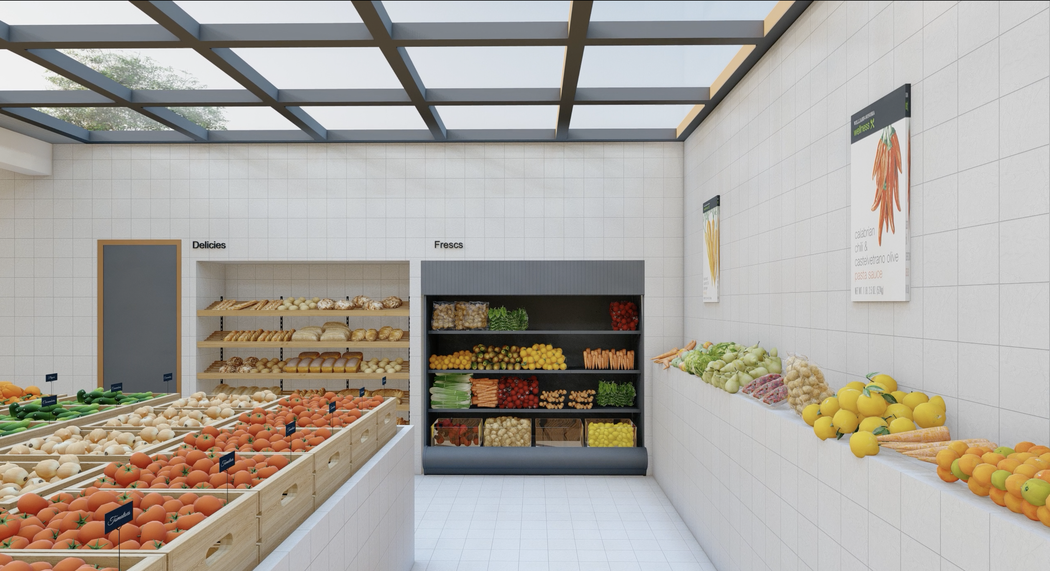 A modular grocery outpost designed for northern British Columbia, built around the idea of local farm pods and short supply chains. The interior is organized as a tiled field with simple crate displays, a lightweight grid ceiling and clear sightlines, creating a space that feels both infrastructural and warm. The design explores how small retail buildings can serve as territorial anchors for remote communities, supporting local growers while offering a calm and functional environment.